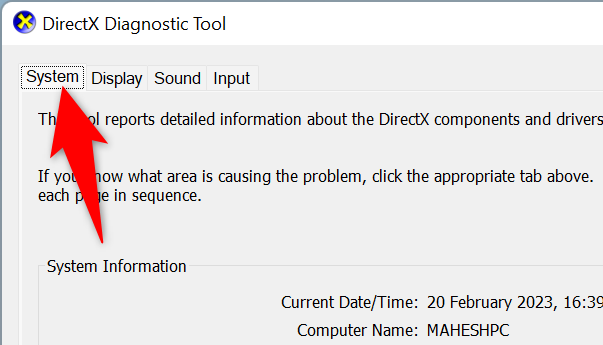 You’ll see a “DirectX Diagnostic Tool” window. Here, at the top, select the “System” tab.